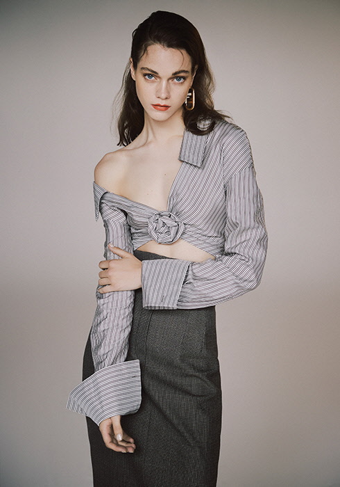 스트라이프 실크 셔츠 3백만원대, 그레이 울 스커트 가격 미정, 골드 이어링 가격 미정 모두 펜디.