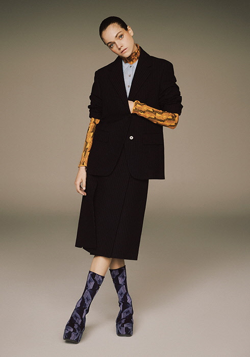 네이비 재킷, 옐로 패턴 터틀넥, 스카이 블루 니트 톱, 네이비 스커트, 삭스 부츠 모두 가격 미정 프라다.