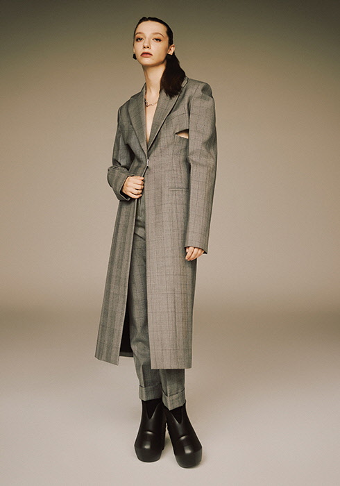 아방가르드한 오버사이즈 코트 5백18만원, 그레이 체크 팬츠 1백38만원, 웨지 앵클부츠 가격 미정, 블랙 큐브 이어링 가격 미정, 실버 네크리스 가격 미정 모두 지방시.