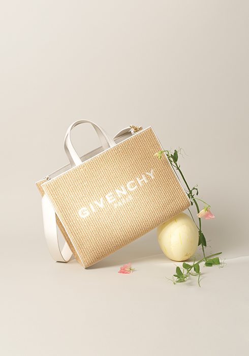 활용도 높은 미디엄 사이즈의 라피아 소재 백으로, 화이트 로고를 심플하게 인그레이빙해 깔끔하고 모던한 느낌을 준다. 스트랩이 내장되어 있어 크로스 보디 형태로도 연출 가능한 G-TOTE 미디엄 라피아 백 1백73만원 지방시. 문의 02-546-2790