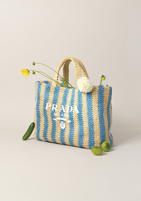 서머 분위기를 물씬 풍기는 천연 라피아 소재로 제작했으며, 라이트 블루 스트라이프 패턴이 시원한 느낌을 주고, 큰 사이즈로 뛰어난 수납력을 자랑한다. 2백76만원 프라다. 문의 02-3218-5320