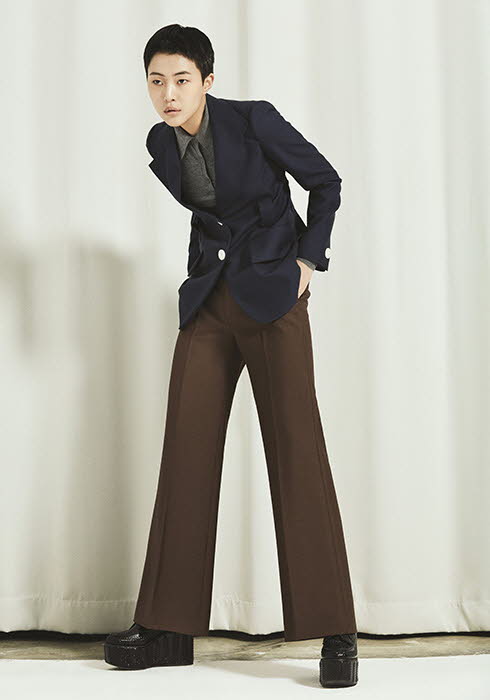 네이비 재킷, 그레이 니트 톱, 브라운 팬츠, 블랙 통굽 슈즈 모두 가격 미정 프라다.