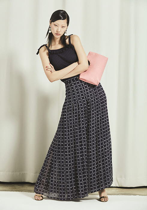 네이비 톱, 패턴드 와이드 팬츠, 핑크 클러치 모두 가격 미정 샤넬. 골드 스트랩 펌프스 1백39만원 지안비토 로시. 주얼 이어링 가격 미정 주미 림.