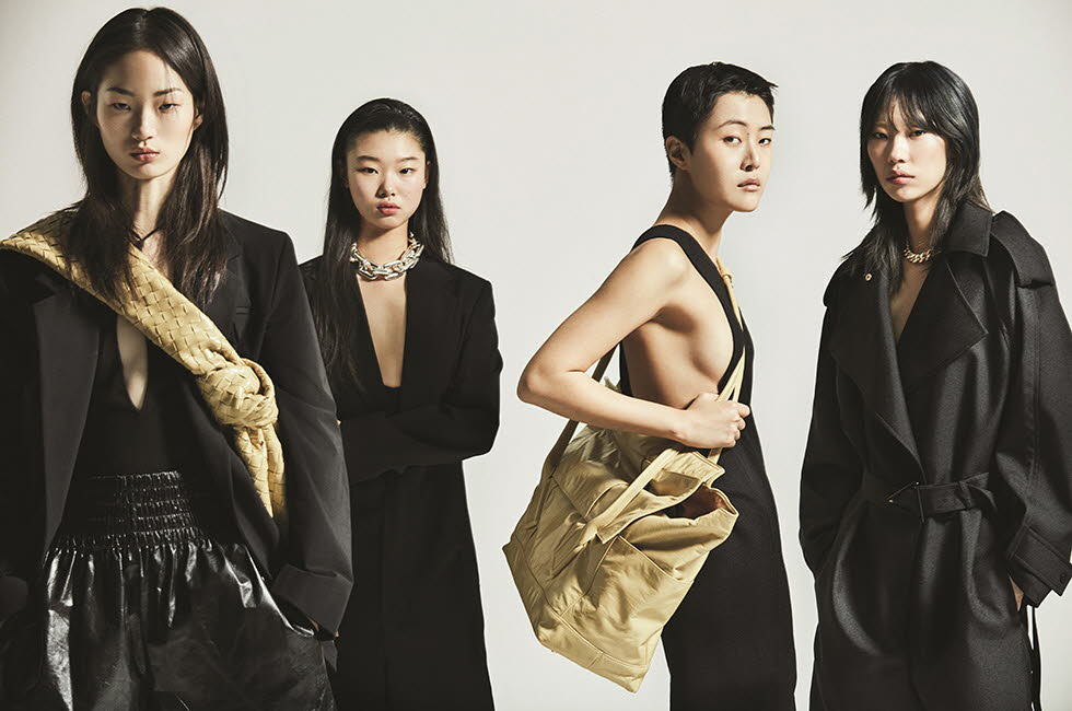 (왼쪽부터 순서대로) 블랙 재킷 3백20만원, 니트 보디수트 1백79만원, 레더 쇼츠 3백4만5천원, 베이지 레더 빅 백 7백85만원 모두 보테가 베네타. 블랙 점프수트 가격 미정, 니트 보디수트 가격 미정, 실버 네크리스 가격 미정 모두 보테가 베네타.