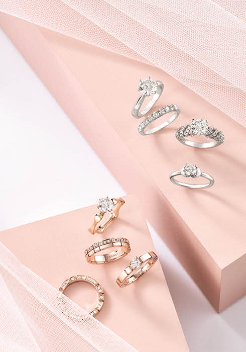(오른쪽 면 위부터 아래로) 2.04캐럿 다이아몬드와 플래티넘으로 심플하면서도 우아한 아름다움을 강조한 피아체레 솔리테어 링, 플래티넘 밴드를 따라 다이아몬드를 섬세하게 세팅한 피아체레 하프 에타니티 링, 1.57캐럿의 솔리테어 다이아몬드와 밴드 부분의 멜레 다이아몬드로 화려하고 볼드하게 완성한 바운드 인게이지먼트 링, 반으로 커팅한 5mm 아코야 진주 사이로 최상급 0.5캐럿 다이아몬드를 세팅한, 디자인이 독특한 인블룸 링.