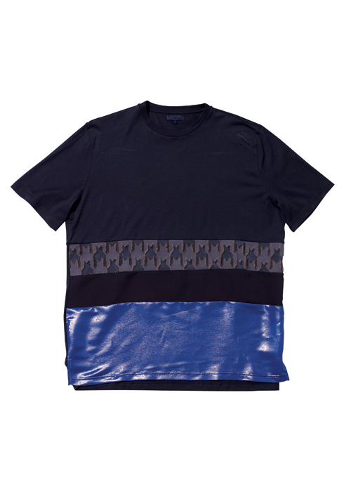 중앙을 가로지르는 패턴과 블루 컬러 밑단이 포인트인 티셔츠 79만원 랑방옴므.