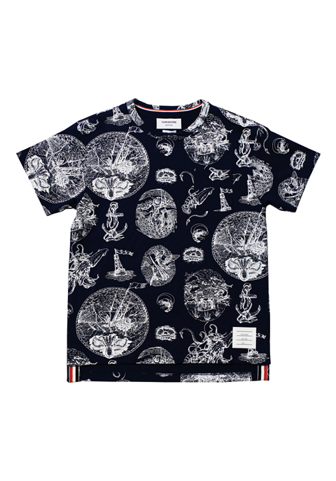닻, 등대, 새우 등 바다 모티브의 프린트로 가득 채운 네이비 티셔츠 58만원 톰 브라운.