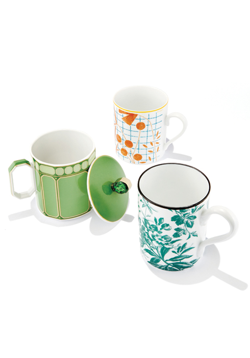 싱그러움이 느껴지는 그린 컬러로 찻잔 덮개를 크리스털로 장식한 로젠탈 머그 26만5천원 스와로브스키. 문의 02-6911-0883. 메종의 시그너처 오렌지 컬러에 귀여운 일러스트가 그려진 포슬린 소재 워크 인 더 가든 컬렉션 머그 27만원 에르메스. 문의 02-542-6622. 터쿼이즈 블루 컬러 허베리움 패턴을 더한 화이트 머그 50만원대 구찌. 문의 02-3452-1521
