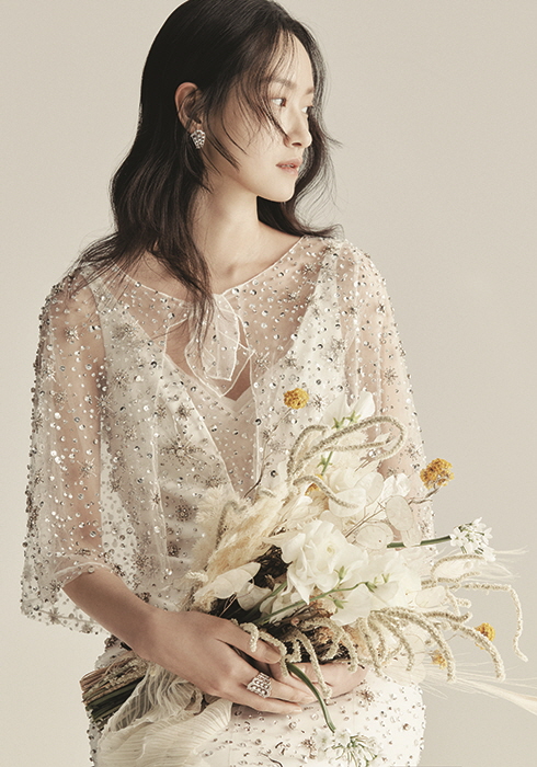 케이프 디테일이 로맨틱한 주얼 장식 드레스 가격 미정 제니팩햄 by 소유 브라이덜. 고전미를 강조한 화이트 골드 소재 버레스크 다이아몬드 이어링 1천2백9만원, 이어링과 페어로 착용하면 더욱 돋보이는 선형적 디자인의 버레스크 화이트 골드 링 1천2백99만원 모두 다미아니.