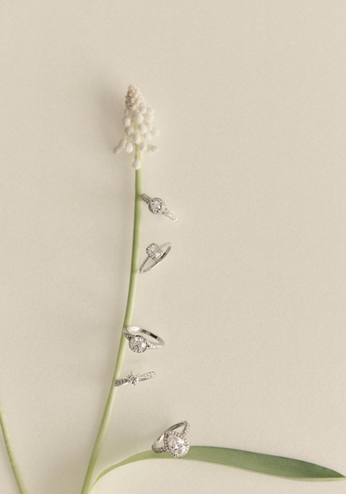 (위부터) 6개의 프롱이 다이아몬드 센터 스톤을 들어 올리고 있는 입체적인 디자인의 미누 인게이지먼트 링 7백64만원 다미아니. 에메랄드 컷 다이아몬드와 밴드를 따라 파베 세팅한 다이아몬드가 눈부시게 빛나는 티파니 에메랄드 컷 솔리스트 인게이지먼트 링 가격 미정 티파니. 플래티넘 보디 중앙에 1캐럿에 달하는 라운드 컷 다이아몬드를 세팅한 인콘트로 다모레 인게이지먼트 링 4천1백만원대 불가리. 클래식한 디자인의 플래티넘 보디 위에 라운드 브릴리언트 컷 다이아몬드로 광채를 더한 피아체레 솔리테어 파베 링 9백만원대 타사키. 2캐럿에 달하는 눈부신 다이아몬드의 빛으로 ‘영원한 삶’의 약속을 상징하는 까르띠에 데스티네 솔리테어 링 1억원대 까르띠에.