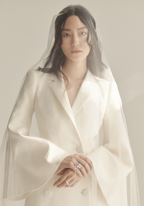 와이드 파고다 슬리브가 인상적인 화이트 더블 버튼 코트 5백만원대 펜디. 화이트 브라이덜 베일 34만원 톰 포드. 왼손 중지에 착용한 꾸 데끌라 드 까르띠에 화이트 골드 링은 나선형 디자인의 볼륨감 넘치는 보디에 총 1.04캐럿의 브릴리언트 컷 다이아몬드 55개를 세팅했다. 2천6백만원대. 오른손 약지에 착용한 갈랑트리 드 까르띠에 화이트 골드 링은 브릴리언트 컷 다이아몬드를 파베 세팅하고 블랙 래커로 장식했다. 7천6백만원대. 모두 까르띠에.