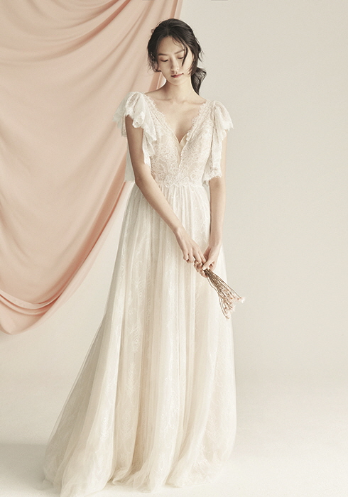 러플 장식으로 포인트를 준 사랑스러운 무드의 레이스 코젯트 드레스 7백만원 이명순웨딩드레스.