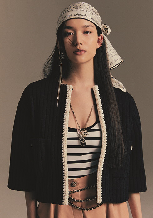 머리에 두건처럼 두른 후 작은 리본을 묶어 연출한 실크 트윌 소재 헤드 웨어, 저지 소재 재킷, 스트레치 저지 스윔 수트, 램 스킨 레더 팬츠, 립스틱 모양의 메탈 네크리스, 이어커프, 드롭 이어링, 모두 가격 미정 샤넬.