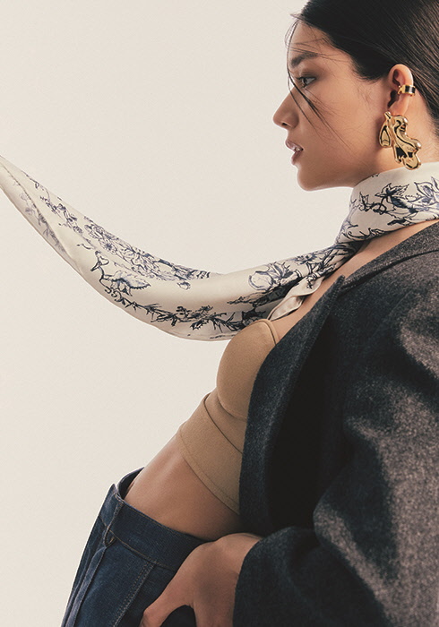 클래식하고 미니멀한 디자인으로 옷 스타일이나 컬러에 구애받지 않고 두루 활용하기 좋은 핸드-롤 실크 트윌 스퀘어 가격 미정 디올. 싱글브레스트 재킷, 하이웨이스트 포켓 데님 팬츠 모두 가격 미정 생 로랑 바이 안토니 바카렐로. 코튼 브라 톱 가격 미정 버버리. 구조적인 폴리지 이어링 91만원 질 샌더. 블랙 이어커프 40만원대 에르메스.