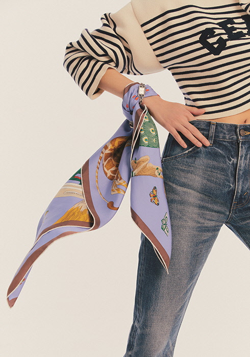 손목에 워치와 함께 레이어드하면 자유분방하고 세련미 넘치는 인상을 줄 수 있다. 에르메스 스토리를 담아낸 실크 스카프 60만원대, 체인 장식이 우아한 난투켓 워치 4백만원대 모두 에르메스. 머린 스타일 코튼 스웨터, 클래식 코튼 리지드 데님 진 모두 가격 미정 셀린느.