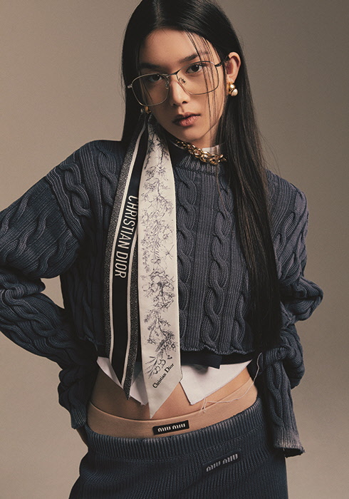 이어링에 장착해 소프트 주얼리로 활용한 프티 사이즈 미차 스카프 가격 미정 디올. 케이블 코튼 니트 1백80만원, 스커트 1백40만원대, 체인 네크리스 1백20만원대, 진주 이어링 50만원대, 네이비 피케 셔츠, 화이트 셔츠, 로고 장식 브리프 모두 가격 미정 미우미우. 스퀘어 메탈 프레임 모라 02 아이웨어 28만원 젠틀몬스터.