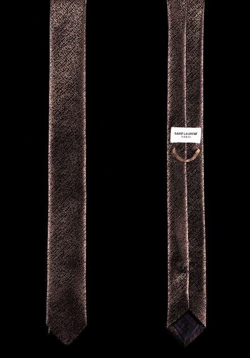 골드 라메의 독특한 질감이 느껴지는 실크 소재 슬림 타이. 슬림 핏 수트와 가장 잘 어울리는 디자인이다. 28만원 생로랑.