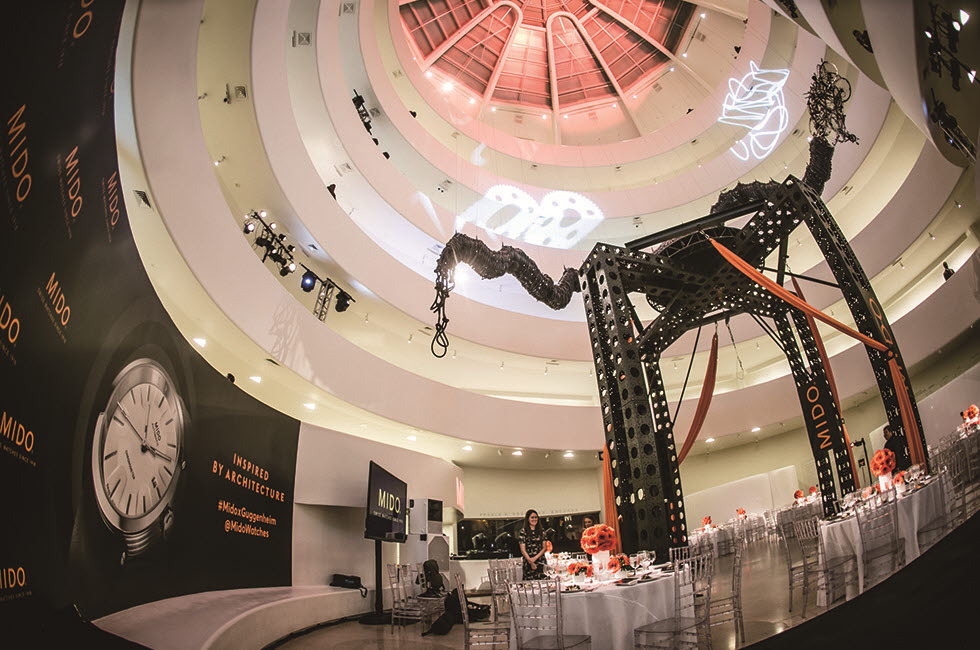 지난 10월 27일 저녁 뉴욕 구겐하임 미술관(Solomon R. Guggenheim Museum). 공중 댄서들이 구겐하임 미술관의 심장인 중앙 아트리움에서 미도의 상징인 주황색 실크 천을 이용해 공중 곡예를 선보이며 미도 구겐하임 워치의 탄생을 기념하는 갈라 디너가 시작되었다. 미도의 CEO 프란츠 린더가 직접 5백 피스 한정인 구겐하임 리미티드 에디션(Guggenheim Limited Edition)을 선보였고, 세계적으로 잘 알려진 이 건축물의 나선 구조와 원형 홀에서 모티브를 얻어 완성한 미도 시계 컬렉션은 새 생명을 부여받았다. 박진감 넘치고 역동적인 행사장의 모든 요소는 구겐하임과 미도의 새로운 워치를 표현하기 위해 움직였고, 매력적인 곡선과 선명한 컬러, 예술적인 자태를 담은 시계는 파티의 주인공으로서 당당한 모습을 드러냈다. 미도 워치와 건축물의 관계는 너무나 핵심적이고 의미심장한 파트너십이다. 렌 오페라하우스에서 영감을 받은 바론첼리 컬렉션, 시드니 하버 브리지에서 모티브를 얻은 멀티 포트 컬렉션, 콜로세움의 건축적 요소를 고스란히 담은 올 다이얼 컬렉션 등 미도의 모든 시계는 유서 깊은 건축물과 궤를 같이한다. 구겐하임 미술관 역시 이러한 미도의 히스토리를 기념하는 또 하나의 발견이다.