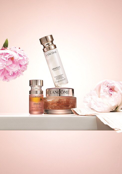 (왼쪽부터) 압솔뤼 프레셔스 셀 로즈 드롭 나이트 필링 컨센트레이트 스킨케어 제품의 흡수력을 높이는 홈 케어 필링. 핑크 로즈층이 피부 표면의 묵은 각질을 제거해 톤을 맑게 하고 골드 오일층이 장미의 영양 성분을 공급해 부드러운 피붓결로 마무리한다. 15ml 17만5천원. 압솔뤼 프레셔스 셀 너리싱 앤 리바이탈라이징 로즈 마스크 장미수와 꽃잎을 담아 은은한 향을 느끼며 수분 충전 및 영양 공급을 할 수 있는 젤 마스크. 눈가와 입가를 제외한 얼굴과 목에 발라 10분간 흡수시키고 닦아내면 수분감과 탄력을 느낄 수 있다. 75ml 23만원대. 압솔뤼 화이트 아우라 세럼 피부 자생력을 강화하는 화이트 로즈 추출물, ACTYL-C™ 화이트닝 성분을 함유해 피부 톤 정돈 및 색소침착 개선에 도움을 주는 세럼. 30ml 39만4천원. 문의 080-022-3332