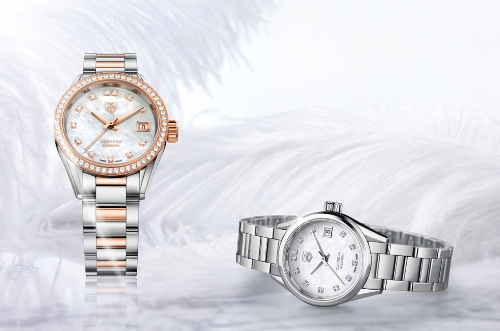 사진 속 아름다운 깃털 사이에 화사하게 자태를 드러낸 워치가 이번에 소개할 태그호이어의 뉴 까레라 레이디 컬렉션(New Carrera Lady Collection)이다. 아마 시계에 관심이 없는 사람이라도 태그호이어(TAG Heuer)라는 브랜드명은 들어본 적이 있을 것이다. 전 세계 공항의 가장 큰 전광판에서, 매거진의 광고와 신문 지면에서, 혹은 가까운 사람들의 예물 시계 브랜드 이름으로 한 번쯤은 접해보았을 정도로 유명하다. 태그호이어는 1860년부터 스위스 상티미에(St.Imier)에서 창립자 에드워드 호이어가 탄생시킨 이후 긴 역사를 이어온 기계식 시계 브랜드로, 국내에서는 1980년대부터 이미 큰 성공을 거둔 바 있다. 국내 진출 초기에는 고급 예물 시계 시장을 리드했고, 기계식 시계를 국내에서 대중화하는 데 가장 크게 공헌한 브랜드이기도 하다(여기서 기계식 시계란 전자시계, 즉 건전지를 포함하는 쿼츠 시계가 아닌 오로지 스위스 메이드의 기계식 장치만으로 구동하는, 별도의 동력이 필요 없는 태엽과 시계 부품의 조화가 만들어내는 힘만으로 작동하는 워치를 말한다). 상당한 가격을 지불해야만 구매할 수 있는 데다 스위스 메이드라는 타이틀을 얻기 위해 엄격한 기준을 요구하는 기계식 시계 시장에서 대중성을 확보한다는 것은 굉장히 어려운 일이다. 그러나 태그호이어는 일찍이 까다로운 눈높이를 충족하며 세계인의 마음을 사로잡았다. 캐머런 디아즈, 레오나르도 디카프리오와 같은 세계적인 할리우드 배우를 앰배서더로 기용하고 스포츠 마케팅을 펼쳐 꾸준히 인지도를 쌓아나갔다. 물론 가장 기본이 된 것은 매력적인 디자인과 확실한 기술력이다. 클래식하고 모던한 디자인은 물론 끊임없는 기술 개발을 통해 탄생시킨 전문적인 고급 스포츠 워치 기능과 정밀한 크로노그래프 기능을 담아 기록적인 성과를 이루고 있다.