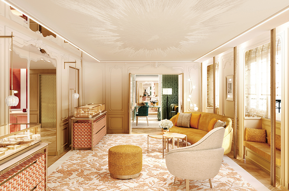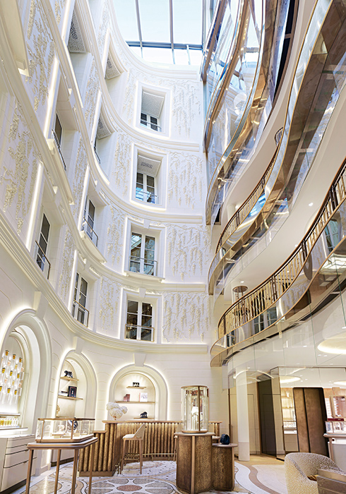 2층 전체는 하이 주얼리를 위한 공간이다. 자연광이 들어오는 낮 동안 뤼 드 라 뻬가 내려다보이는 여러 개의 살롱은 방문객들이 메종의 영향력과 특정 스타일을 보여준 주요 시대에 빠져들게 한다. 아트리움에서 이어지는 2대의 승강기를 통해 까르띠에가 제공하는 서비스(관리, 수선, 퍼스널라이징 등)를 받을 수 있는 3층으로 바로 이동할 수 있다. 클래식한 우아함, 곡선미, 부드러운 톤, 최상의 소재 등으로 부티크 고유의 전통을 이어가는 한편 명확히 구분된 기능을 수행하는 이 새로운 공간은 현대적인 모습으로 재탄생했다. 4층 공간에는 18개의 작업대가 구비되어 있는데, 아트리움을 통해 들어오는 부드러운 자연광이 작업대 각각에 쏟아져 내린다. 5층 일부 구역에는 메종의 가장 소중한 아카이브 일부가 소장되어 있다.