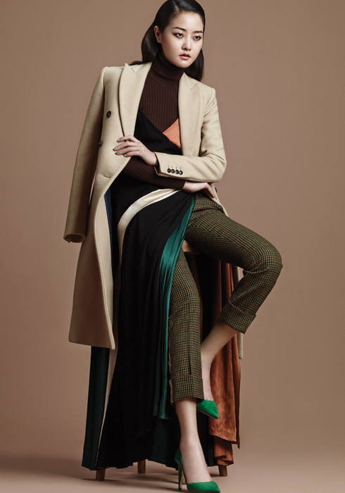 베이지 캐시미어 더블 코트 3백30만원 폴 스미스. 멀티컬러 블록 실크 슬립 드레스 9백40만원 페라가모. 체크 팬츠 가격미정 디스퀘어드2. 그린 컬러 펌프스 94만원 지미추.