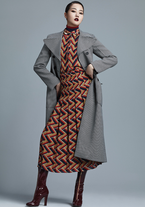 블랙 & 화이트 체크 패턴 코트 5백만원 대, 이너로 착용한 네이비 터틀넥 톱 1백만원 대 모두 루이 비통. 빈티지 무드의 패턴 셔츠 1백82만원, 스커트 1백33만5천원 모두 구찌. 버건디 페이턴트 부츠 가격미정 발렌티노. 스와로브스키 디테일의 골드 네크리스 38만원 미네타니.
