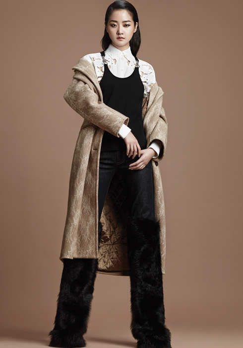 플라워 레이스 디테일의 캐시미어 코트 7백18만원 막스마라. 레이스 펀칭을 더한 화이트 셔츠, 블랙 니트 베스트 모두 가격미정 셀린느. 블랙 시어링 퍼 데님 팬츠 가격미정 펜디.