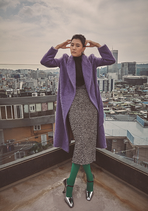 라벤더 컬러 퍼 코트 7백58만원 블루마린. 블랙 & 그레이 셔츠 3백만원대, 스커트 1백40만원대, 실버 펌프스 가격 미정, 그린 타이츠 60만원대 모두 프라다.