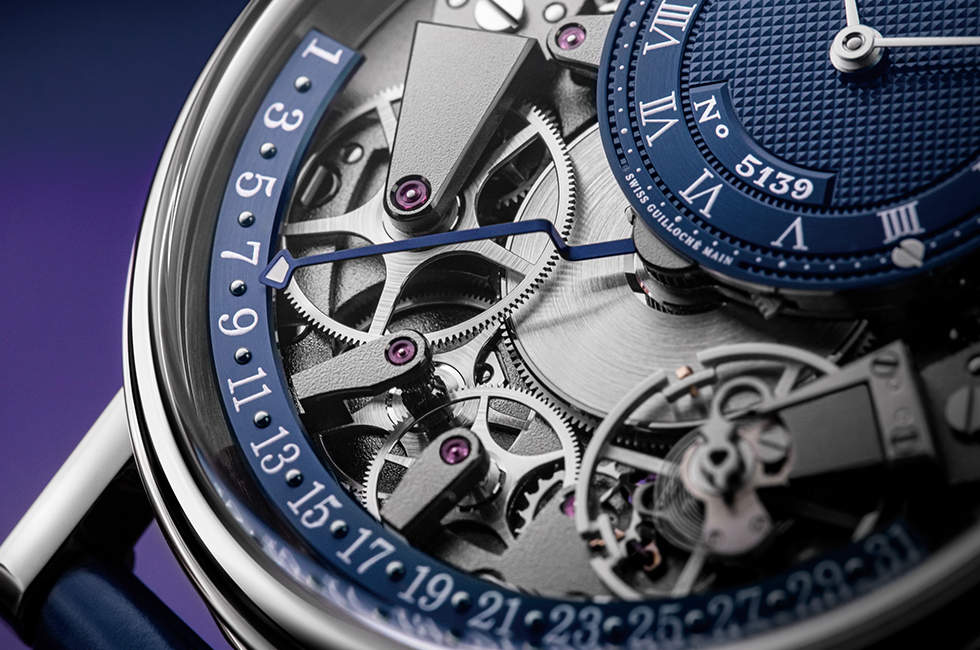트래디션 퓨제 투르비용 7047 창립자 아브라함-루이 브레게의 가장 큰 유산 중 하나인 투르비용의 발명을 기리는 모델. 18세기 남성들이 재킷이나 베스트 등에 소지하고 다니던 포켓 워치는 수직 상태에서 정확성이 떨어지는 문제가 있었다. 이로 인한 오차를 극복하고자 아브라함-루이 브레게는 1801년 최초의 투르비용을 고안해 이에 대한 특허를 출원하며 또 한번 놀라운 업적을 이뤄냈다. 새로운 투르비용 7047 모델에 장착한 퓨제 체인 투르비용의 트랜스미션 메커니즘은 와인딩 수준에 관계없이 일정한 토크(torque, 회전력)를 보장해 시계의 규칙적인 작동을 가능케 하는 특성을 지닌다. 배럴이 완전히 와인딩되면 최대한의 동력이 발휘되는데 체인은 퓨제 상단, 즉 가장 작은 둘레를 따라 움직인다. 체인이 풀리면서 토크는 감소하지만 퓨제의 가장 넓은 부분인 베이스와 나란히 움직이며 전달되는 동력은 일정하게 유지된다. 브랜드의 상징적 코드를 녹여낸 현대적인 디자인의 새로운 투르비용 7047은 기요셰로 클루 드 파리 패턴을 표현한 오프센터 골드 다이얼, 전통적인 로마숫자 인덱스, 사과 형태의 핸즈를 통해 하우스의 유산을 재현했다. 브레게는 시각적으로 통일된 느낌을 주기 위해 부품 전체에 다양한 처리 기법을 사용했는데, 티타늄 소재의 투르비용 케이지와 다이얼은 블루 코팅을, 체인 링크는 푸른빛의 열 처리 과정을 거쳤다. 지름 41mm, 두께 16mm의 플래티넘 케이스 중심에서 힘차게 박동하는 인하우스 수동 칼리버 569는 총 5백42개의 부품으로 구성되었으며, 역선으로 배치한 레버 이스케이프먼트, 실리콘 러그 및 밸런스 스프링을 장착해 자기장의 영향에서 자유롭고 부식과 마모에 강하다. 시간당 1만8천8백 회 진동하며 50시간의 파워 리저브 기능을 갖췄다. 플래티넘 소재의 트리플 블레이드 폴딩 버클을 장착한 미드나잇 블루 컬러 앨리게이터 스트랩과 함께 제공한다.
