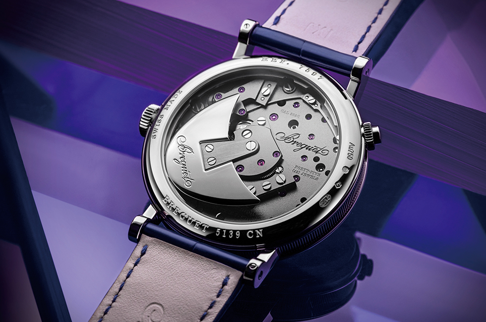 트래디션 레트로그레이드 세컨즈 핸드 7097 특유의 설계를 바탕으로 연탄 그레이 합금 코팅한 무브먼트의 베이스 플레이트를 다이얼 면으로 노출해 기어 트레인을 감상할 수 있도록 했다. 10시 방향에 위치한 레트로그레이드 방식의 세컨즈 핸드에서 이름을 따왔으며, 원형 브러싱 처리한 반원 모티브에 블루 스틸 핸즈를 더해 해당 컴플리케이션이 더욱 돋보인다. 12시 방향에는 전통적인 엔진 터닝 홉네일 패턴의 실버드 골드 다이얼이 자리하는데, 이러한 형태의 다이얼은 아브라함-루이 브레게가 1799년부터 지속적으로 제작한 다수의 택트 워치에서 발견되는 것이기도 하다. 실리콘 팔렛을 장착한 스트레이트 라인 인버트 레버 이스케이프먼트, 뛰어난 정확성을 보장하는 실리콘 브레게 오버 코일 밸런스 스프링을 장착한 셀프 와인딩 무브먼트 505SR1로 구동하며 50시간의 파워 리저브 기능을 제공한다. 사파이어 크리스털 케이스 백을 통해 하우스의 과거 앤티크 워치 스타일을 차용한 골드 와인딩 로터의 모습을 확인할 수 있다. 섬세하게 홈이 파인 케이스 밴드를 갖춘 지름 40mm의 화이트 골드 케이스 또는 로즈 골드 케이스로 전개한다.