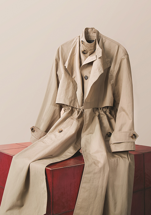 지적인 분위기와 실용적인 면모를 갖춘 트렌치코트.