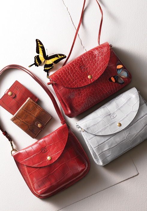 (오른쪽 위부터 시계 방향으로) 악어 프린트의 미니 크로스 백 26X19cm 62만8천원. 그레이 톤이 세련된 미니 크로스 백 26X19cm 62만8천원. 견고하고 탄탄한 셰이프의 미니 숄더백 21X19cm 39만8천원. 콤팩트한 실루엣의 버튼 클로징 반지갑 각 26만8천원 모두 일 비종떼. |