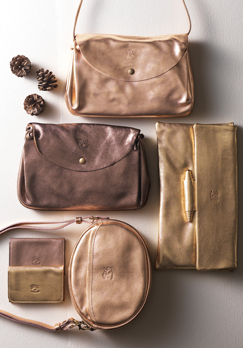 (가운데부터 시계 방향으로) 브론즈 & 핑크 골드 미니 크로스 백 각 26X19cm 59만8천원. 메탈 버클 장식의 골드 클러치 30X16cm 49만8천원. 원형 숄더백 22X16cm 45만8천원. 펄 레더 카드 케이스 각 9만8천원 모두 일 비종떼. |