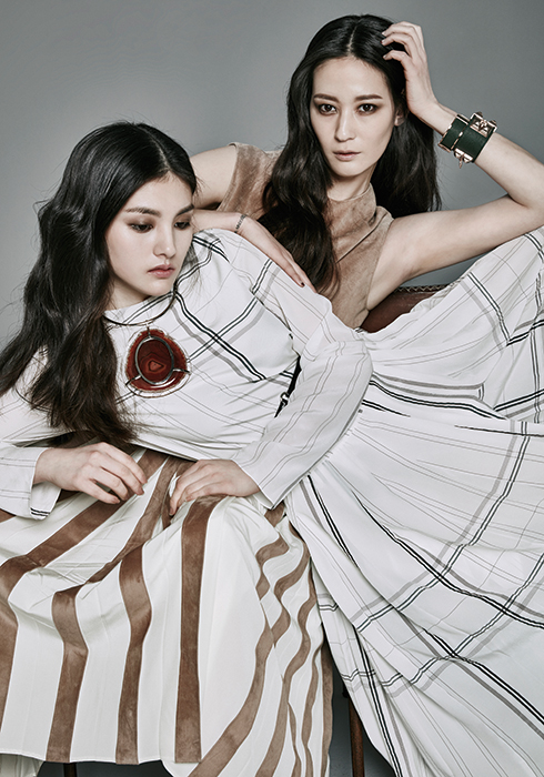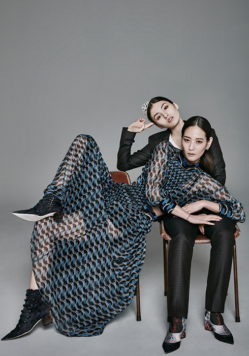 (왼쪽) 블루 패턴 시스루 롱 드레스 5백85만원 펜디. 네이비 패턴 앵클부츠 가격 미정 디올. (오른쪽) 티아라 가격 미정 생 로랑. 스트라이프 재킷과 팬츠, 화이트 레더 크롭트 톱, 레드 패턴 슈즈 모두 가격 미정 디올. |