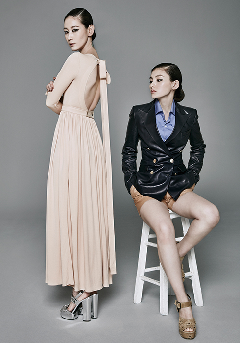 (왼쪽) 누드 컬러 드레스 가격 미정 셀린느. 실버 스트랩 힐 1백50만원대 로저 비비에 (오른쪽) 네이비 컬러 더블 레더 재킷, 블루 컬러 셔츠, 브라운 레더 쇼츠 모두 가격 미정 랄프 로렌 컬렉션. 브라운 플라워 장식 스트랩 힐 1백70만원대 로저 비비에 |