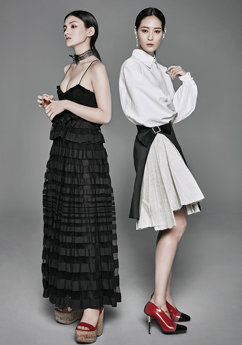 블랙 티어드 롱 드레스 가격 미정 살바토레 페라가모. 주얼 장식 초커 1백89만원 랑방. 레드 스트랩 웨지 슈즈 가격 미정 랄프 로렌 컬렉션. (오른쪽) 벌룬 슬리브리스 화이트 셔츠 1백79만원,사이드 플리츠 디테일의 블랙 스커트 |