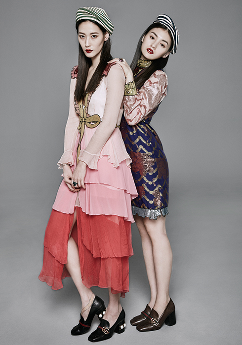 핑크 컬러 리본 디테일 러플 드레스 6백14만원, 그린스트라이프 베레모 38만원, (오른쪽) 블루 패턴 긴소매 원피스 5백57만원, 네이비 스트라이프 베레모 38만원, 핑크 링 76만원, 브라운 슈즈 1백만원대 모두 구찌 |