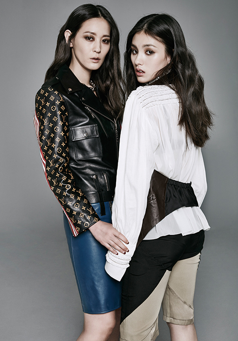 하우스 로고 패턴 멀티컬러 블록 레더 코트, 실버 체인 네크리스 모두 가격 미정 루이 비통. (오른쪽) 러플 디테일의 블라우스, 레더 베스트, 쇼츠 모두 가격 미정 루이 비통. |