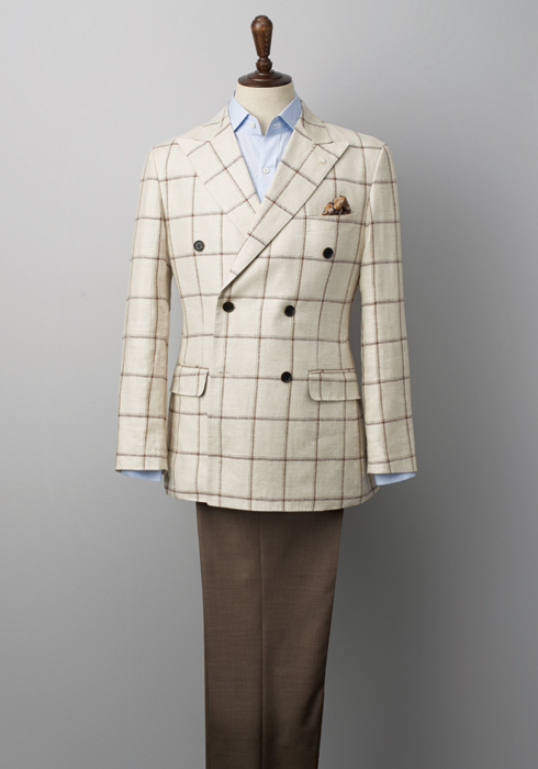 밝은 베이지 컬러에 체크 프린트를 더한 더블브레스트 블레이저는 클래식하면서도 캐주얼한 룩을 완성한다. 타이는 기본적인 솔리드 컬러보다는 화려한 패턴이나 질감에 변화를 준 니트 타이가 더 세련된 느낌을 준다. 온타임에는 재킷보다 한 단계 짙은 브라운 컬러 팬츠로 톤온톤 코디를 하고, 오프타임에는 데님이나 치노 팬츠 등으로 캐주얼한 느낌을 강조하면 감각적인 스타일을 완성할 수 있다. 셔츠와 더블브레스트 블레이저, 팬츠, 행커치프 모두 빨질레리. |