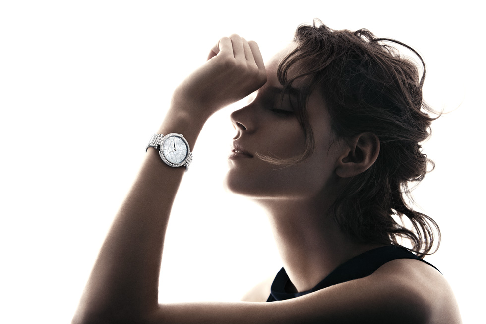 1 브릴리언트 컷 다이아몬드를 베젤에 세팅한 프리미에르 레이디스 36mm 워치를 착용한 모델 광고 비주얼.