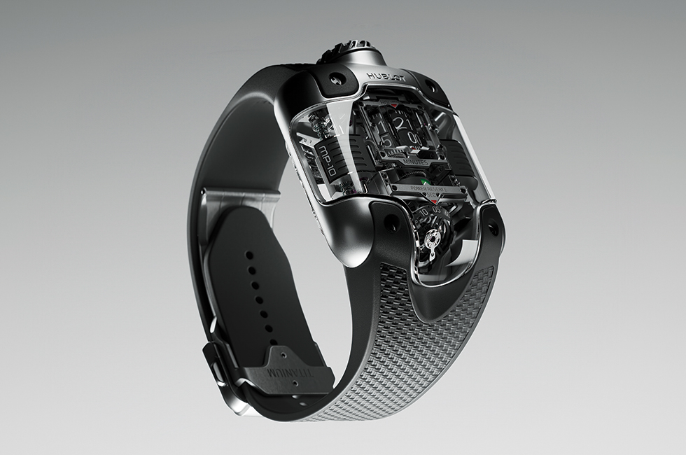 위블로에서 5백92개의 부품, 5년의 연구와 개발 기간, 2개의 선형 추, 35도 경사를 이루는 1개의 투르비용을 갖춘 궁극의 워치, MP-10 투르비용 웨이트 에너지 시스템 티타늄을 새롭게 선보인다. 일반적인 핸즈를 장착하는 대신 끊임없이 회전하는 4개의 디스플레이가 가장 먼저 눈에 띈다. 다이얼 위쪽에는 아워 및 미닛 표시와 투명한 돋보기, 가운데에는 그린 존과 레드 존이 명확하게 구분되는 원형 파워 리저브를 갖추었으며, 아래쪽 투르비용 케이지에서 세컨즈를 표시한다. 이렇게 칼리버와 다이얼을 하나로 결합해 무브먼트 자체가 워치의 얼굴이자 영혼을 부여하는 존재로서 빛난다. 인디케이터는 모두 블랙 알루미늄 롤러에 동일한 화이트 래커 타이포그래피로 장식한 디자인으로 완성해 통일된 느낌을 주며, 각 인디케이터에서는 레드 컬러의 삼각형 마커로 현재 시간을 확인할 수 있다.