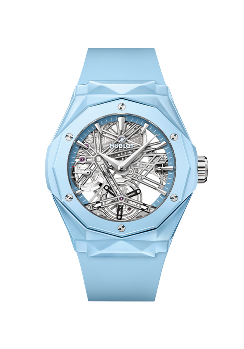 프랑스의 아티스트 리차드 올린스키와 위블로가 협업해 완성한 클래식 퓨전 투르비용 올린스키. 아티스트의 손길로 완성된 선명한 옐로와 스카이 블루 컬러로 선보이는 독창적인 디자인이 특징이다. 이 워치는 수동 와인딩 HUB6021 무브먼트로 구동하며, 크라운 및 베젤 주위에 자리한 6개의 H형 스크루 같은 구성 요소는 블랙 PVD 스켈레톤 브리지를 통해 공중에 떠 있는 것처럼 보인다. 8시에서 9시 사이에는 1백5시간의 파워 리저브 인디케이터가 자리하며, 6시 방향의 투르비용을 통해 시간을 확인할 수 있다. 문의 02-3438-6031