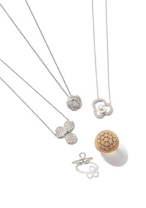 선인장 꽃의 독특한 볼륨감을 표현한 칵투스 드 까르띠에 링 1천8백만원 까르띠에. 진주로 꽃의 단순한 아름다움을 표현한 찬트 네크리스 4백만원대 타사키. 우아한 동백꽃의 아름다움을 간직한 까멜리아 네크리스 가격 미정 샤넬 화인 주얼리. 다이아몬드로 종이 꽃을 표현한 페이퍼 플라워 파베 세팅 다이아몬드 플라워 펜던트 1천만원대, 종이 꽃의 외곽 선을 표현한 페이퍼 플라워 다이아몬드 오픈 플라워 링 6백만원대 모두 티파니.