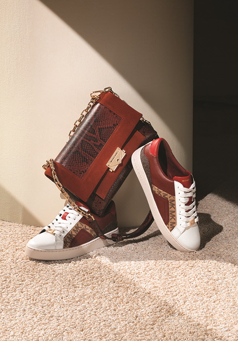 강렬한 레드 파이톤 패턴이 시선을 사로잡는 씨씨 미디엄 체인 숄더백 61만원. 베이지와 브라운 모노그램 패턴을 패치워크한 사이러스 레이스업 스니커즈 25만원. 모두 마이클 코어스. 넉넉한 수납공간을 자랑하는 에바 라지 토트백. 탈착 가능한 별도의 내장 파우치로 실용성을 배가했다. 41만원. 5cm 높이의 두툼한 아웃솔이 특징인 킬리 트레이너 슈즈 35만원. 모두 마이클 코어스. 문의 02-3479-1852
