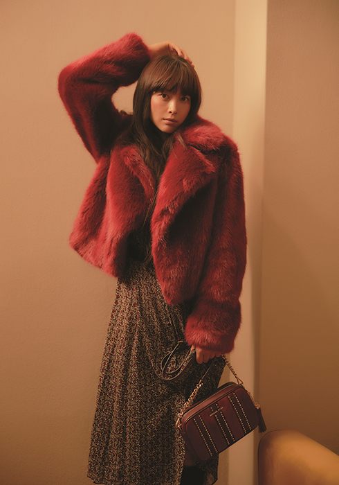 어두운 레드 컬러 크롭트 퍼 재킷 69만원, 튤립 셔츠 드레스 35만원, 크로스 보디 카메라 백 45만원 모두 마이클 마이클 코어스.