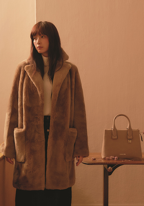 베이지 컬러 시어링 코쿤 코트 2백90만원, 프린지 터틀넥 스웨터 35만원, 버튼 프런트 스커트 21만원, 롤린스 미디엄 사첼 백 55만원 모두 마이클 마이클 코어스.