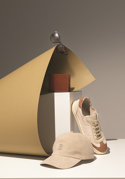 (위부터) 올리버 피플스와 협업해 선보이는 니노 선글라스 2백만원대, 가죽 고유의 자연스러운 텍스처가 고급스러운 반지갑 60만원, 가벼운 무게와 편안한 착용감을 보장하는 송아지가죽으로 배색한 코튼 스니커즈 1백만원대, 부드럽고 기능적인 형태를 갖춘 스웨이드 볼캡 90만원대 모두 브루넬로 쿠치넬리. 문의 02-3448-2931