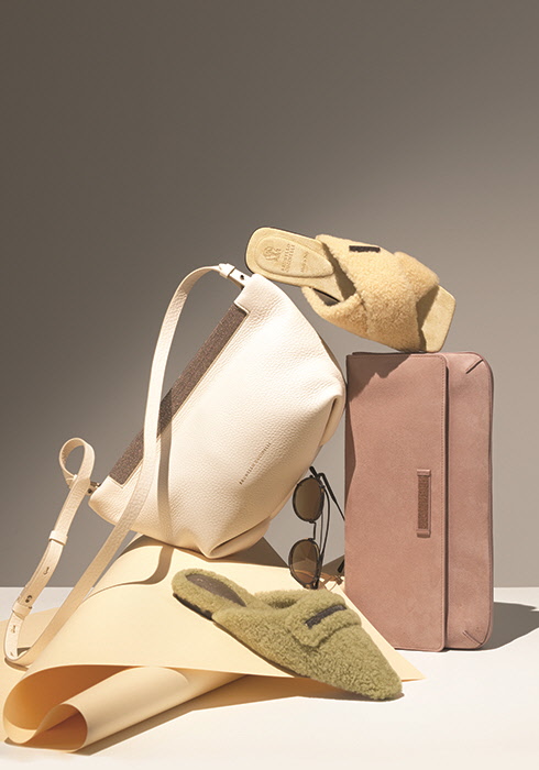 (위부터 시계 방향으로) 상큼한 레몬 컬러가 기분 좋은 에너지를 전하는 시어링 슬라이드 1백만원대, 벨벳같이 부드럽게 마감한 누벅에서 섬세하고 우아한 매력이 느껴지는 클러치 백 2백만원대, 싱그러운 대나무 그린 컬러를 입힌 시어링 블로퍼 1백만원대, 유니크한 디자인의 메탈 선글라스 80만원대, 길이 조절 가능한 숄더 스트랩과 넉넉한 수납공간으로 실용성을 높이고 특유의 모닐리 밴딩으로 상징성까지 더한 화이트 가죽 크로스 백 3백만원대 모두 브루넬로 쿠치넬리. 문의 02-3448-2931