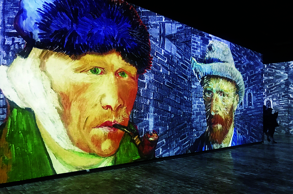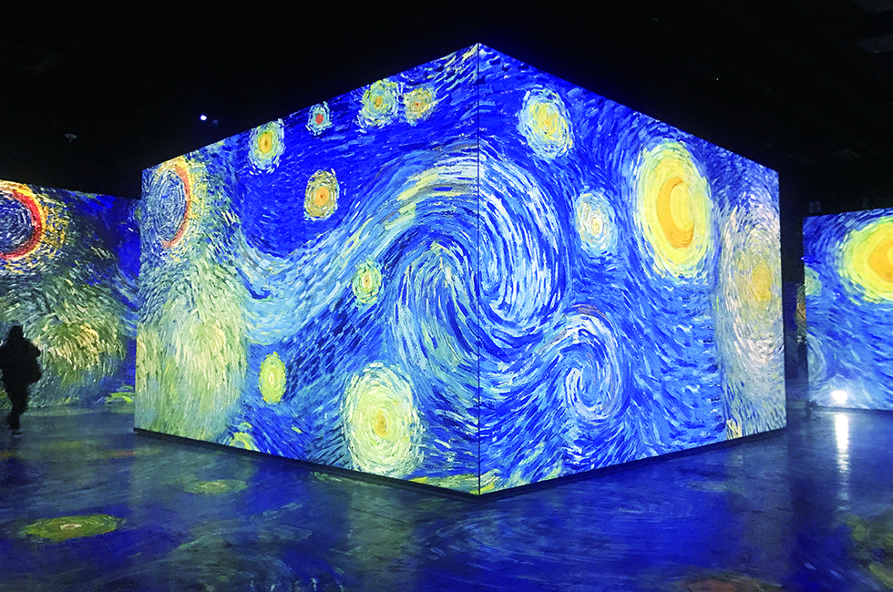 스크린이 춤을 춘다. 햇빛의 결실 같은 풍요로운 노란색이 하늘을 물들이고, 푸른 밀밭이 파도처럼 살랑이는 프로방스의 눈부신 자연이 추는, 느릿하고 우아한 춤이다. 그에 맞게 흥을 북돋는 음악은 재니스 조플린의 ‘코즈믹 블루스’. 처음부터 강렬하게 시선을 사로잡은 이 서정적인 풍경을 이루는 이미지들은 꽤 낯이 익다. 다름 아닌 빈센트 반 고흐(Vincent van Gogh)가 프로방스에 머물던 시절에 그린 풍경화인데, 그중에는 ‘씨 뿌리는 사람’(1888) 같은 명작도 있다. 축복의 춤을 추는 밀밭이 스르르 사라지면 어둡고 우울한 프랑스 북부 지방으로 배경이 바뀌면서 많은 이들에게 익숙한 작품 ‘감자 먹는 사람들’(1885)이 등장한다. 이윽고 다시 남쪽으로 내려가, 반 고흐가 많은 명작을 남긴 남부의 도시 아를(Arles)에서 완성한 ‘해바라기’(1888)가 스크린을 장악하고, 근사한 파리 풍경도 펼쳐진다. 이런 식으로 벽과 바닥 등에서 음악을 배경으로 뛰노는 이미지들의 향연을 즐기노라면 30여 분이 그야말로 ‘순삭’이다.